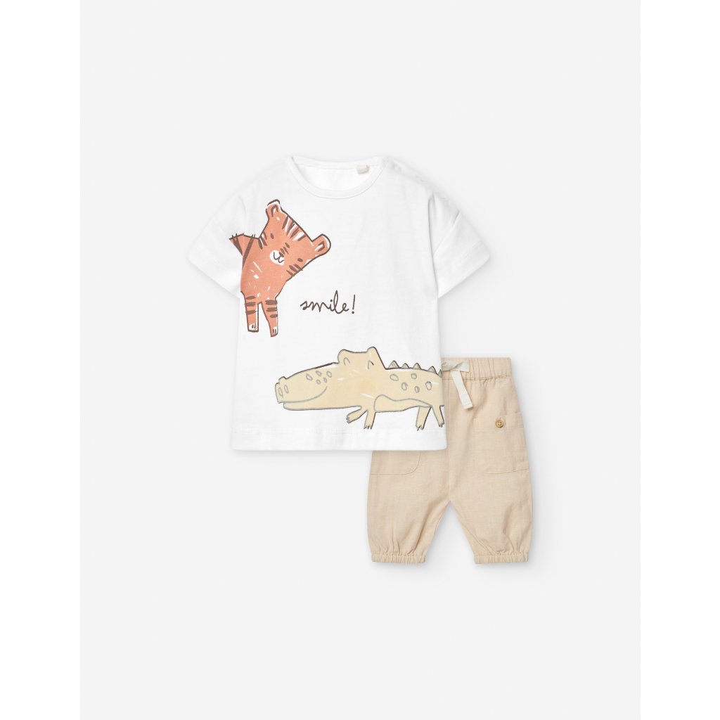 Letní 2-dílná chlapecká souprava tričko + kalhoty pro nejmenší. Tričko je vyrobené ze 100 % bavlny, má potisk na přední straně a klasický kulatý výstřih pro pohodlné každodenní nošení.