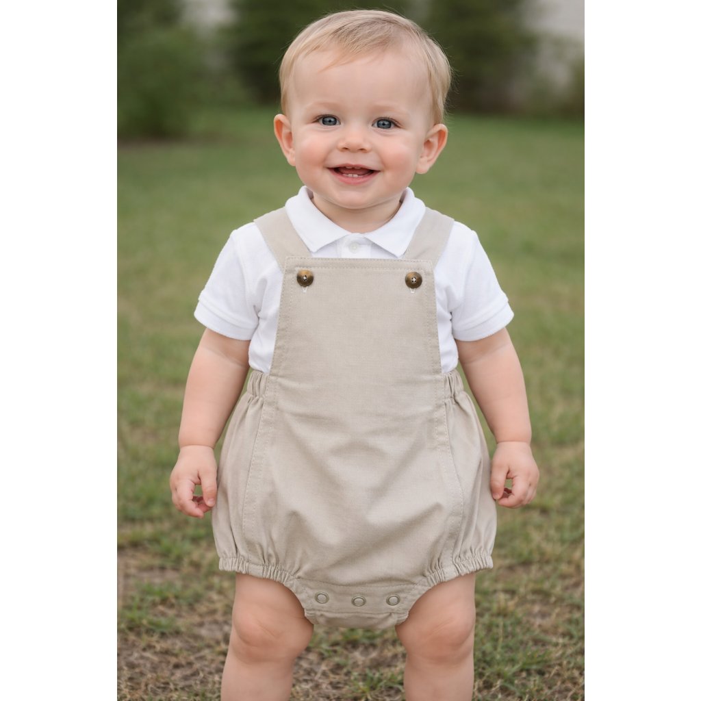 Dvoudílný letní chlapecký set v béžovo-bílé barevné kombinaci je ideální volbou na teplé dny i slavnostnější příležitosti. Set sestává z bílé polokošile s krátkým rukávem a béžových krátkých kalhot na traky, které spolu vytvářejí stylový a nadčasový outfit. Příjemné materiály a pohodlný střih zajišťují komfort po celý den, zatímco traky dodávají elegantní vzhled.