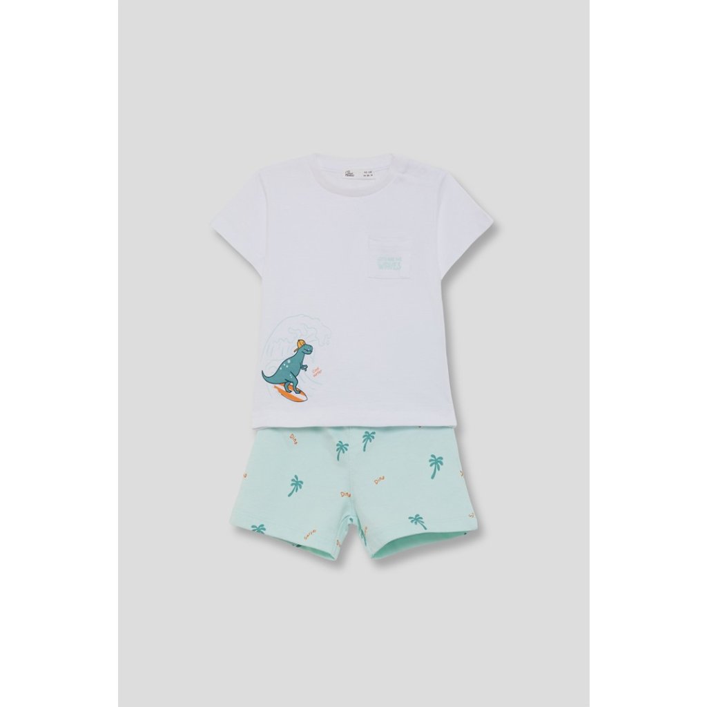 Tato veselá letní souprava je ideální pro malé dobrodruhy a kombinuje pohodlí a styl. Sada obsahuje tričko s roztomilým dinosaurem a pohodlný županšortky s letním potiskemkteré dodávají oblečení hravý a svěží vzhled. Vyrobeno z100% bavlna, materiál je měkký, prodyšný a šetrný k citlivé dětské pokožce. Ideální pro horké dny plné hraní a zkoumání.