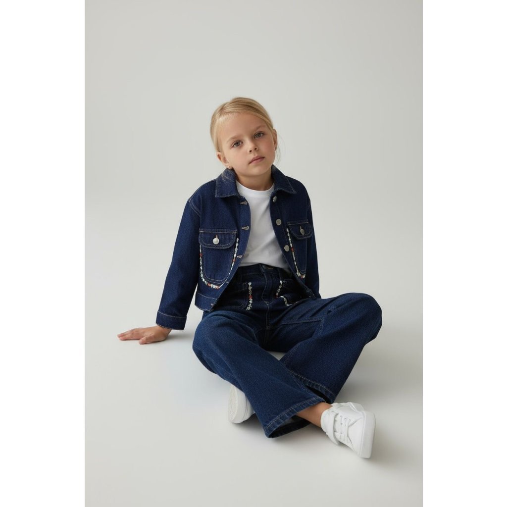 Stylová riflová bunda se zapínáním na patentky. Vpředu jsou praktické kapsy a okraje bundy jsou jemně zdobené vyšívanými květinami, které dodávají kousku ženský a originální vzhled. Bunda je ideální na běžné nošení i stylové kombinace.