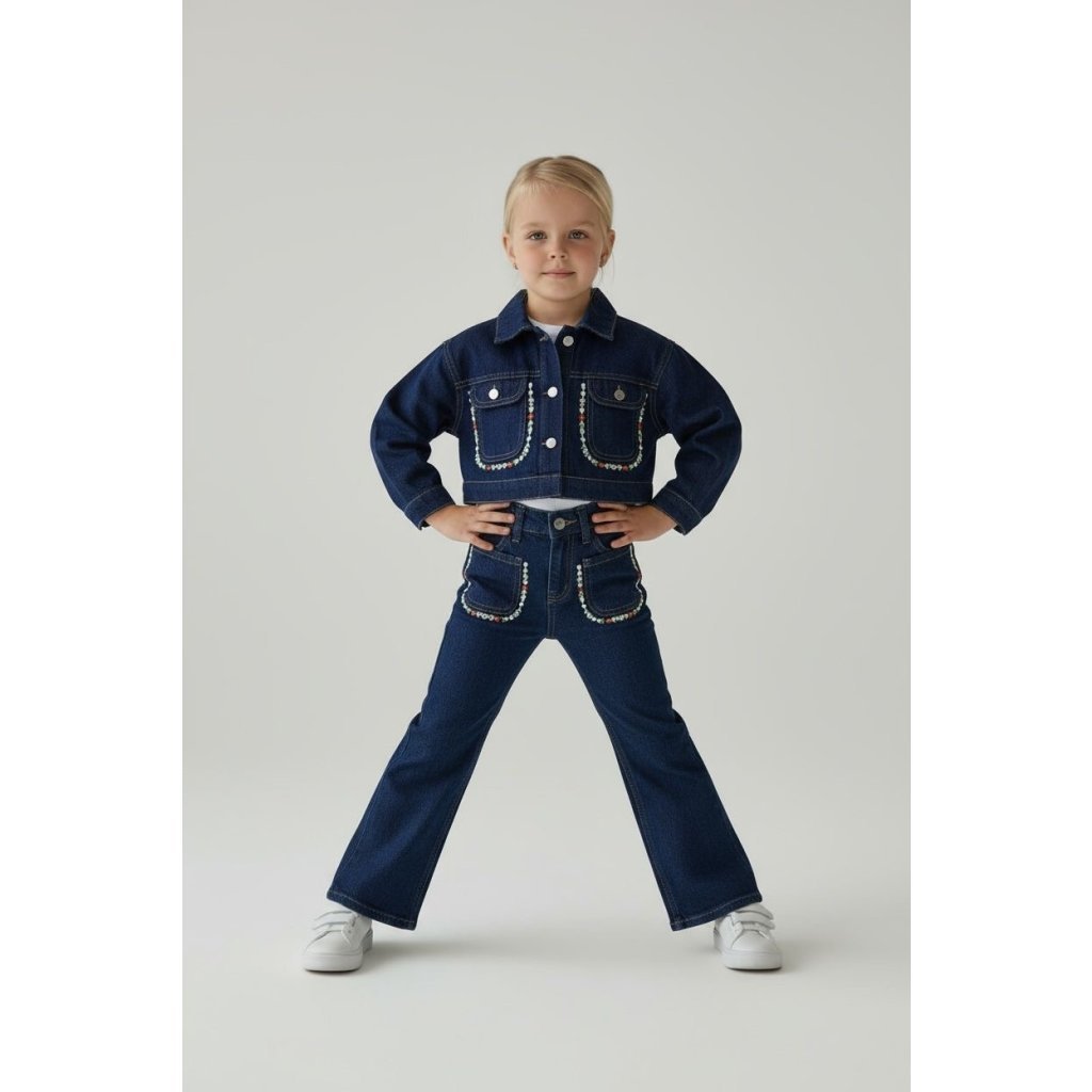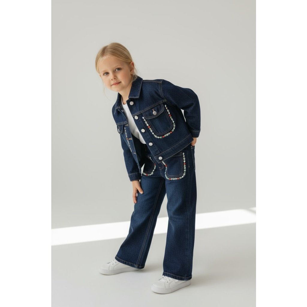 „Objevte nadčasový outfit, který spojuje pohodlí a styl. Riflová bunda s jemnými květinovými detaily v kombinaci s klasickými džínami a jednobarevným bílým tričkem vytváří dokonalý look na každý den. Ideální volba pro slečny, které milují jednoduchou eleganci s nádechem originality.