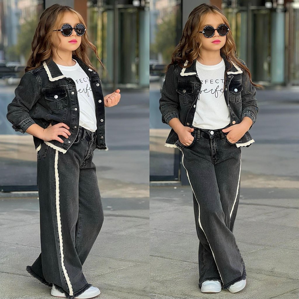 Stylová riflová souprava s tričkem, která zaujme jemnými a ženskými detaily. Jednobarevné tričko s decentním nápisem. Riflová bunda i džíny jsou ozvláštněny jemnou krajkou na spodním lemu a po stranách nohavic, díky čemuž působí celý outfit moderně a zároveň romanticky.