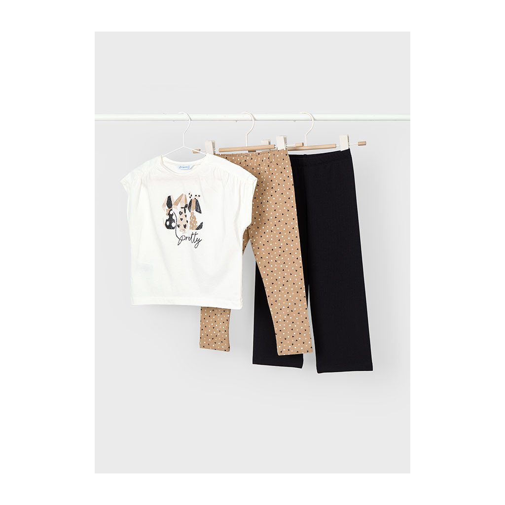 Praktický a pohodlný dívčí 3-dílný bavlněný set obsahuje tričko s krátkým rukávem, elastické legíny a volné kalhoty, které poskytují maximální volnost pohybu. Měkký bavlněný materiál je příjemný na celodenní nošení a ideální do školy, na volný čas či výlety. Univerzální a pohodlný set, který spojuje styl s komfortem pro aktivní malé slečny.