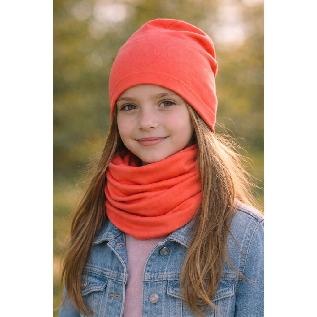 Praktická a pohodlná sada pro děti na jaro a podzim. Jednobarevná bavlněná čepice spolu s nákrčníkem spolehlivě chrání hlavu, uši a krk před větrem a chladnějším počasím a zároveň zůstává příjemně prodyšná.
