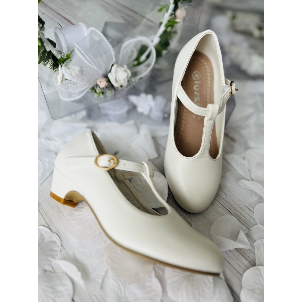 Bílé balerínky na první svaté přijímání s malým podpatkem, velmi oblíbené u malých dívek, jsou elegantním doplňkem vhodným na slavnostní příležitosti. Jemný design krásně doplňuje přijímané šaty a podtrhuje výjimečný charakter tohoto dne. Vrchní část z umělého materiálu je hladká, snadno udržovatelná a působí čistě a upraveně.