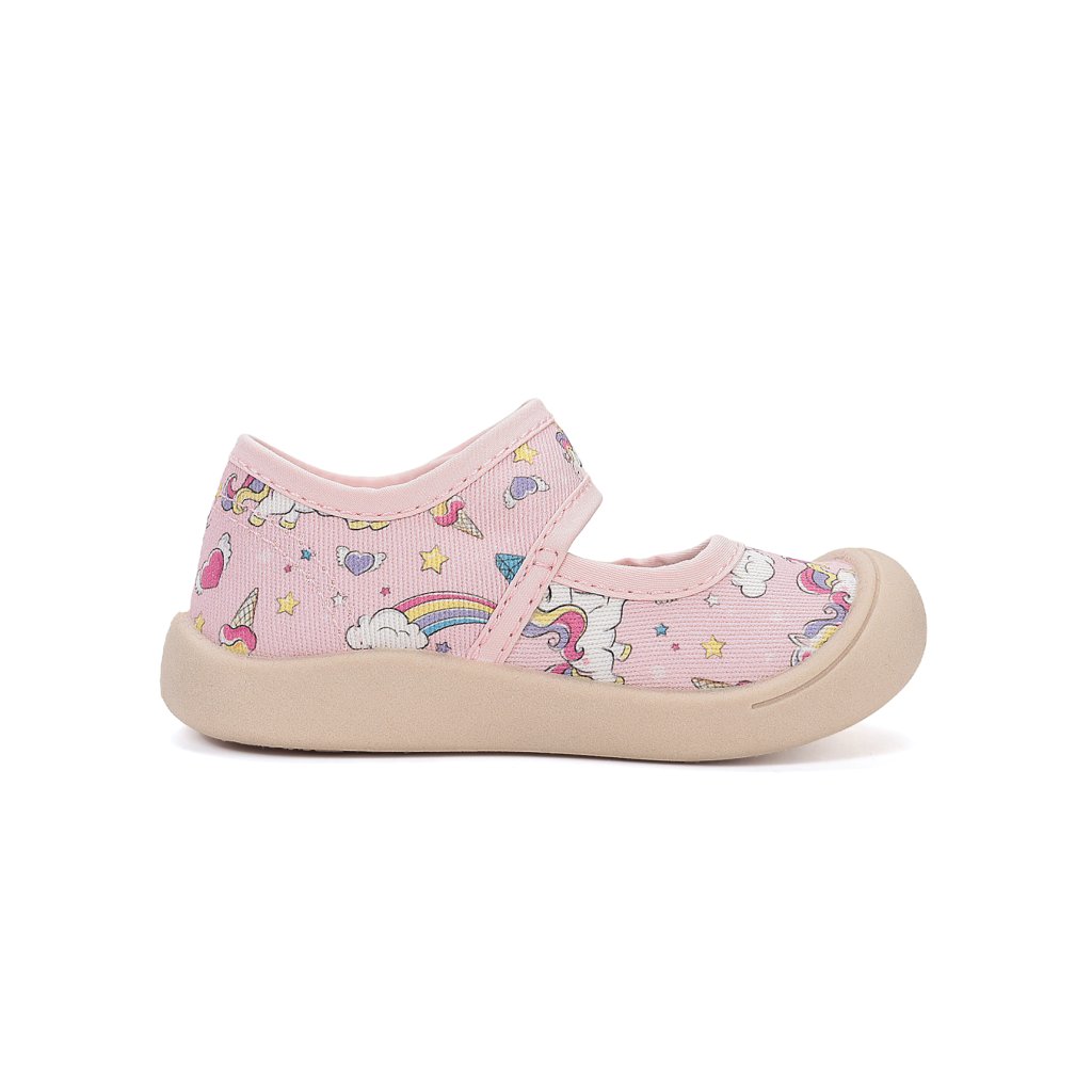Roztomilé dětské plátěnky s veselou potiskem jednorožce jsou ideální volbou pro malé parádnice. Balerínkový střih působí elegantně a zároveň zajišťuje pohodlné nošení po celý den. Praktické zapínání na suchý zip umožňuje rychlé a jednoduché obouvání, které zvládnou i menší děti.