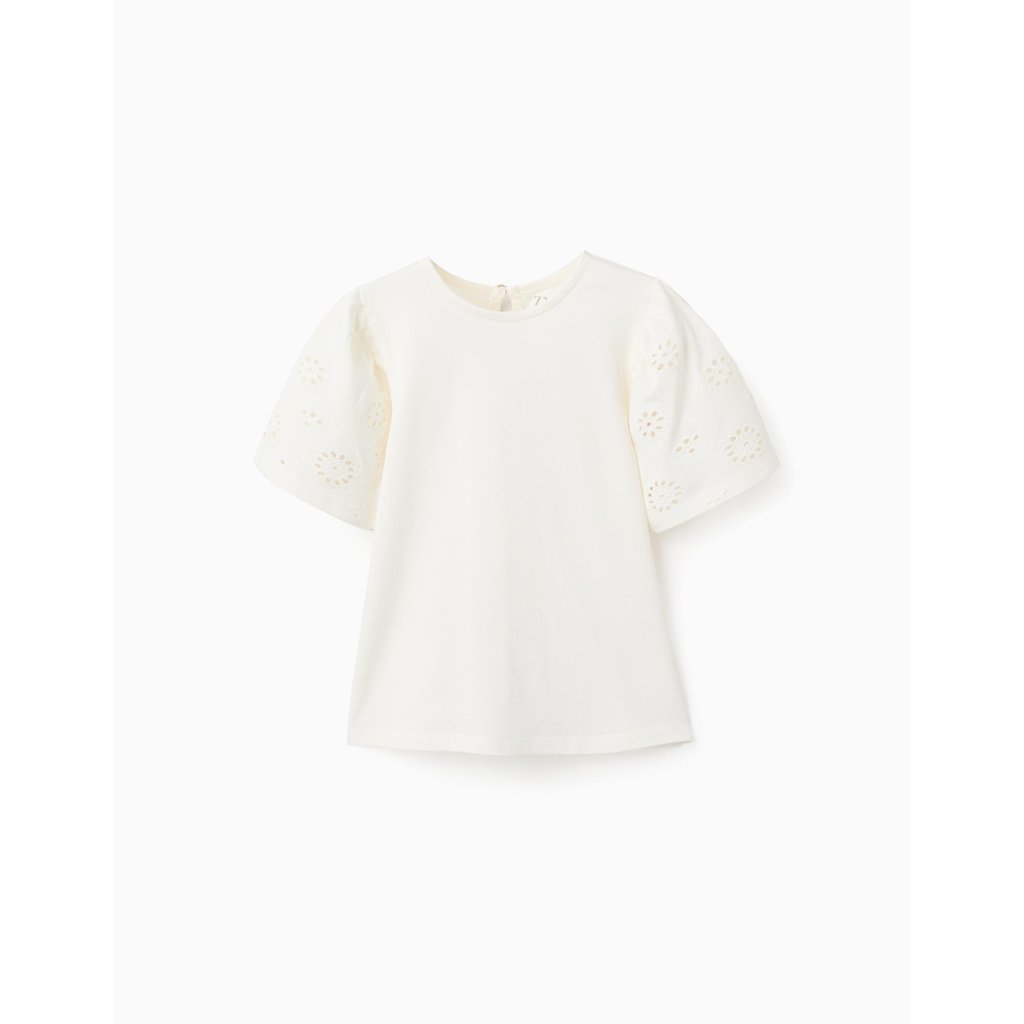 Dívčí bavlněné tričko s krátkým rukávem v bílé barvě je nadčasovým a pohodlným kouskem do dětského šatníku. Jemná výšivka na rukávech dodává tričku elegantní a dívčí vzhled. Kvalitní bavlna je příjemná na dotek, šetrná k dětské pokožce a zajišťuje komfort po celý den. Tričko je ideální na každodenní nošení i slavnostnější příležitosti.