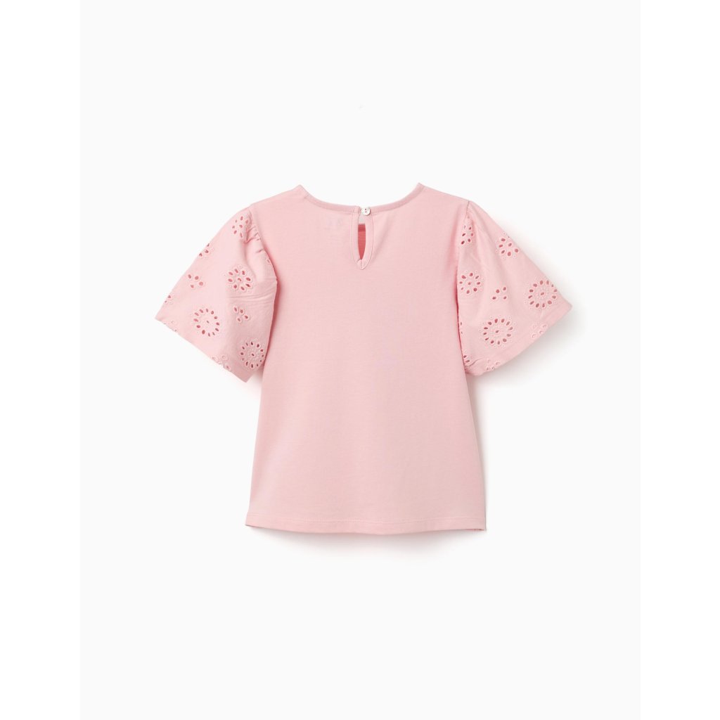Dívčí bavlněné tričko s krátkým rukávem v jemné růžové barvě je pohodlným a zároveň stylovým kouskem na každodenní nošení. Ozdobná výšivka na rukávech dodává tričku něžný a dívčí vzhled. Kvalitní bavlna je příjemná na dotek, šetrná k dětské pokožce a zajišťuje pohodlí po celý den.