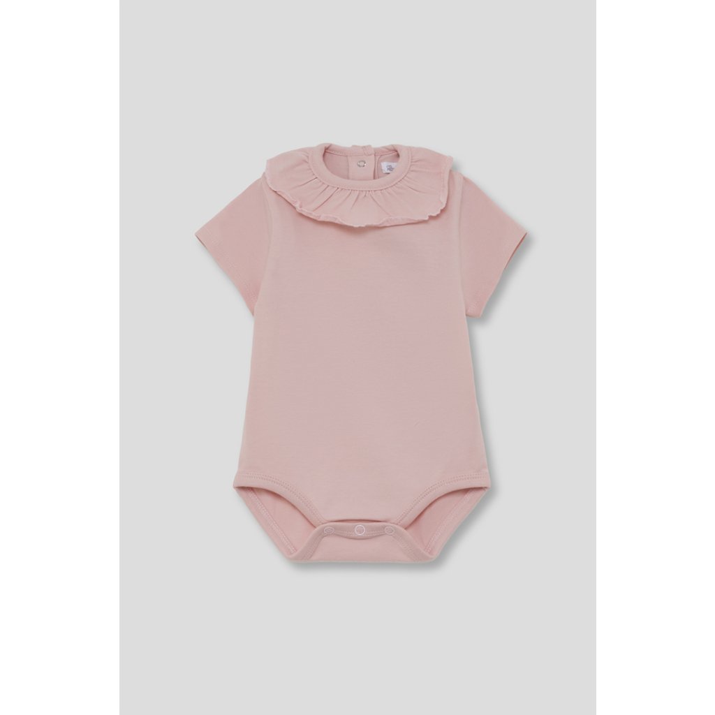 Toto body je vyrobeno z vysoce kvalitní bavlny, která je přirozeně měkká, prodyšná a jemná k citlivé dětské pokožce. Krátké rukávy zajišťují pohodlí v teplých dnech a elegantní volánek u krku dodává body jemný a stylový vzhled.