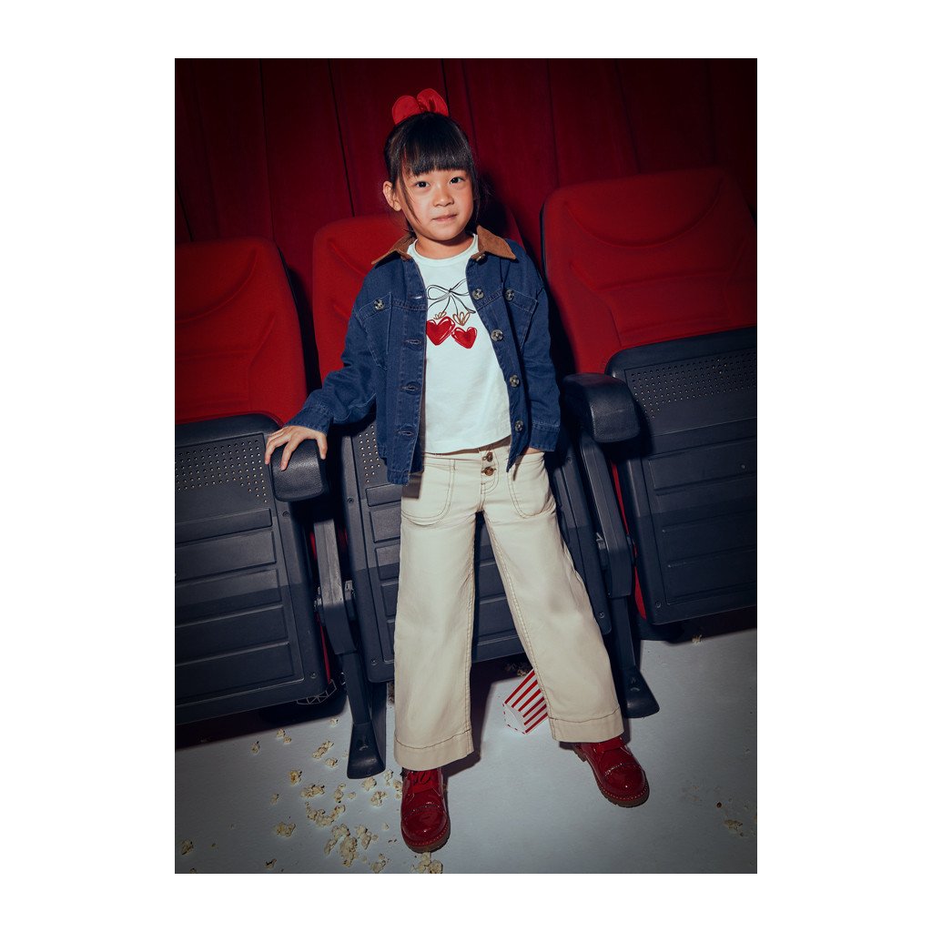 Stylové dívčí elastické rifle s rozšířeným střihem a zapínáním na knoflíky v nadčasové béžové barvě jsou pohodlné a zároveň trendy. Měkký a odolný materiál zaručuje komfort po celý den, zatímco volnější střih umožňuje volný pohyb.