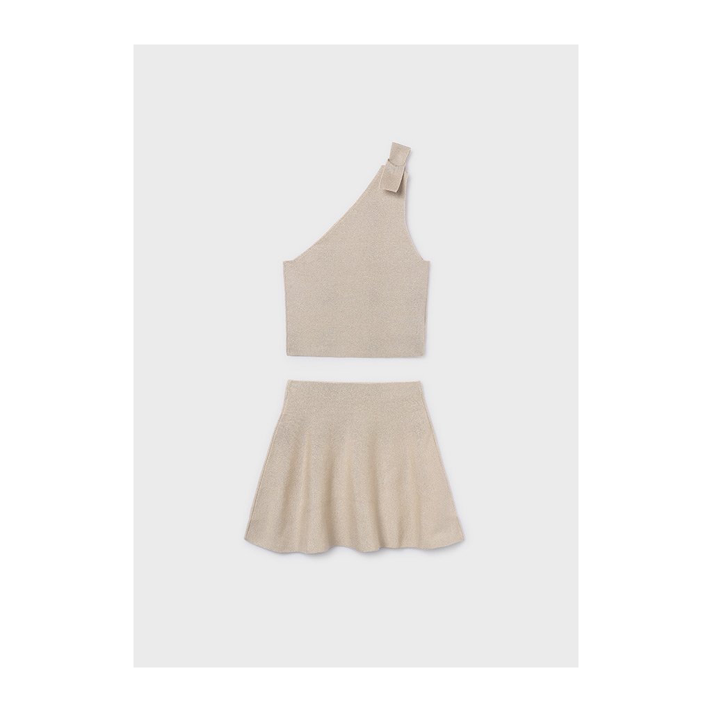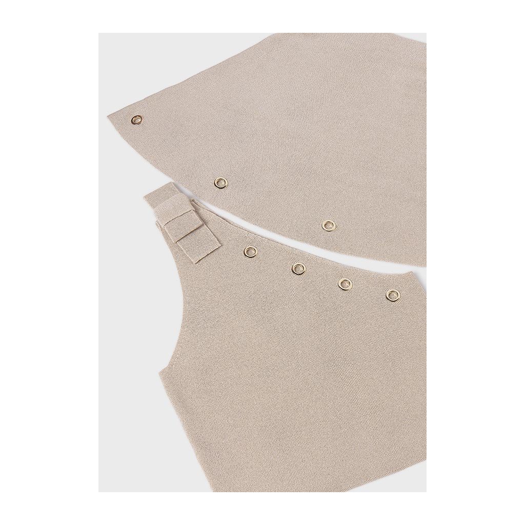 Elegantní dětský set značky Mayoral z jemné, příjemné pleteniny působí výjimečně a stylově. Design doplňují kovové kruhy, které slouží jako jemná ozdoba a dodávají outfitu moderní nádech.