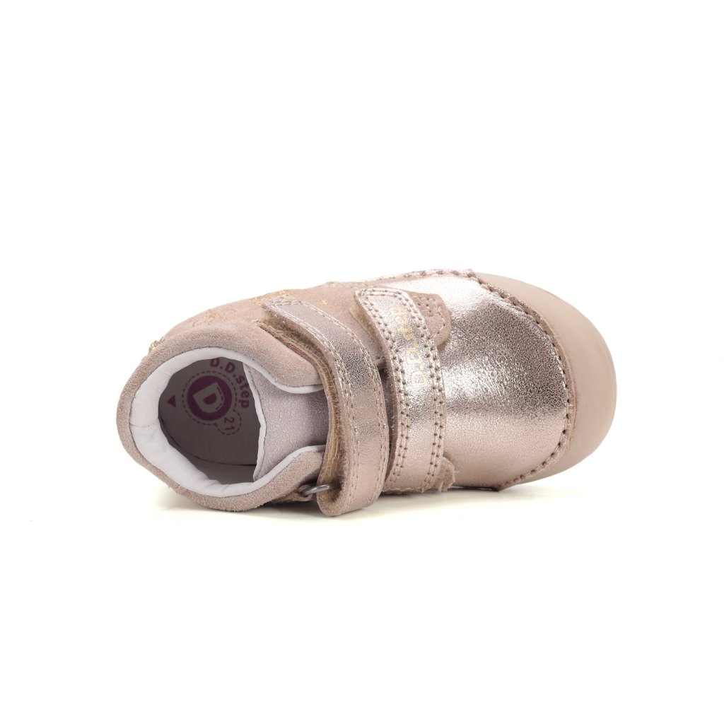 KLASICKÉ, ORTOPEDICKÉ: Topánky sú mierne vystužené, s tvarovanou ortopedickou vložkou. Každý produkt D.D.Step je vyrobený z pravej, kvalitnej hovädzej kože, aby sa zabezpečilo najlepšie prispôsobenie detskej nohe. Predná časť topánky je navrhnutá tak, aby chránila prsty, umožnila ich správny rast a zároveň zvýšila odolnosť obuvi. Formovaná výstuha poskytuje oporu a dlhotrvajúce spevnenie v oblasti päty. PVC výstuž je umiestnená medzi podšívkou a zvrškom, takže sa priamo nedotýka nohy, ale správne fixuje pätovú kosť.