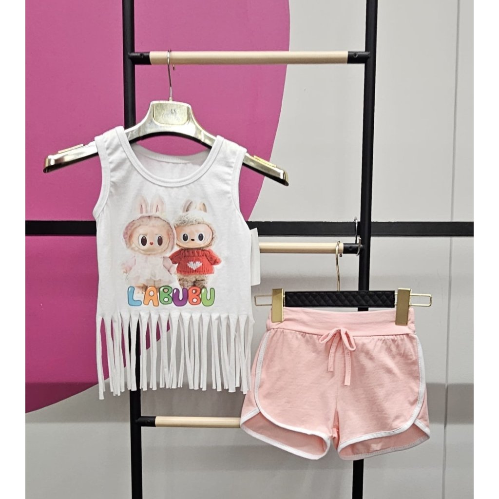Stylový a pohodlný letní bavlněný set pro malé slečny, který spojuje hravost s komfortem. Tento dvoudílný set obsahuje strapcový bílý top s potiskem labubu a pohodlné šortky, ideální na horké letní dny a volnočasové aktivity.
