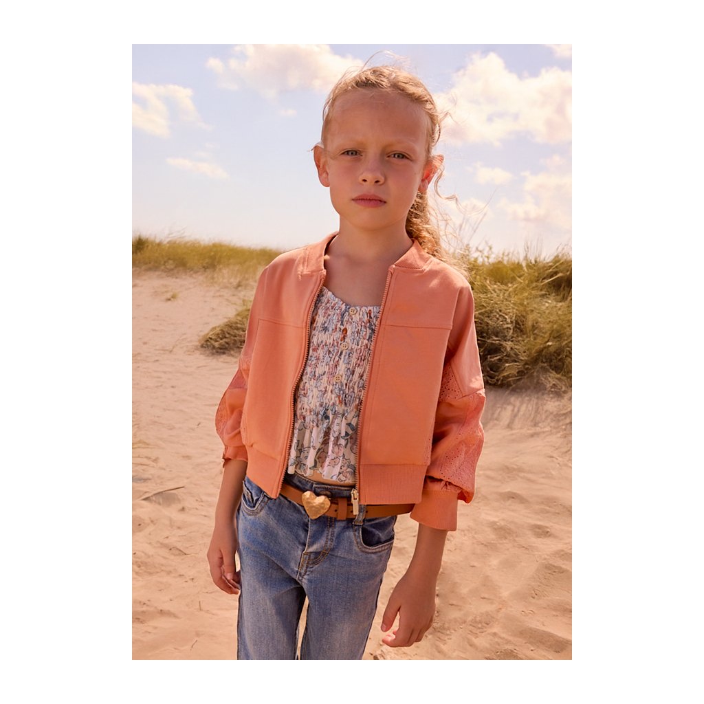 Krátká dětská mikina bez kapuce v lososové barvě je stylová a pohodlná. Mikina je zdobená jemnou madeirovou vsadkou, která jí dodává originální a elegantní vzhled.