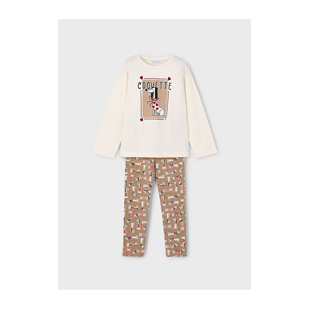 Roztomilý 2-dílný dívčí set od značky MAYORAL, který se skládá z dlouhých rukávů trička s potiskem ježečka a pohodlných legín. Tričko je vyrobeno z měkké bavlny, má příjemný střih a hravý motiv veselého psa, který si malé slečny okamžitě zamilují.
