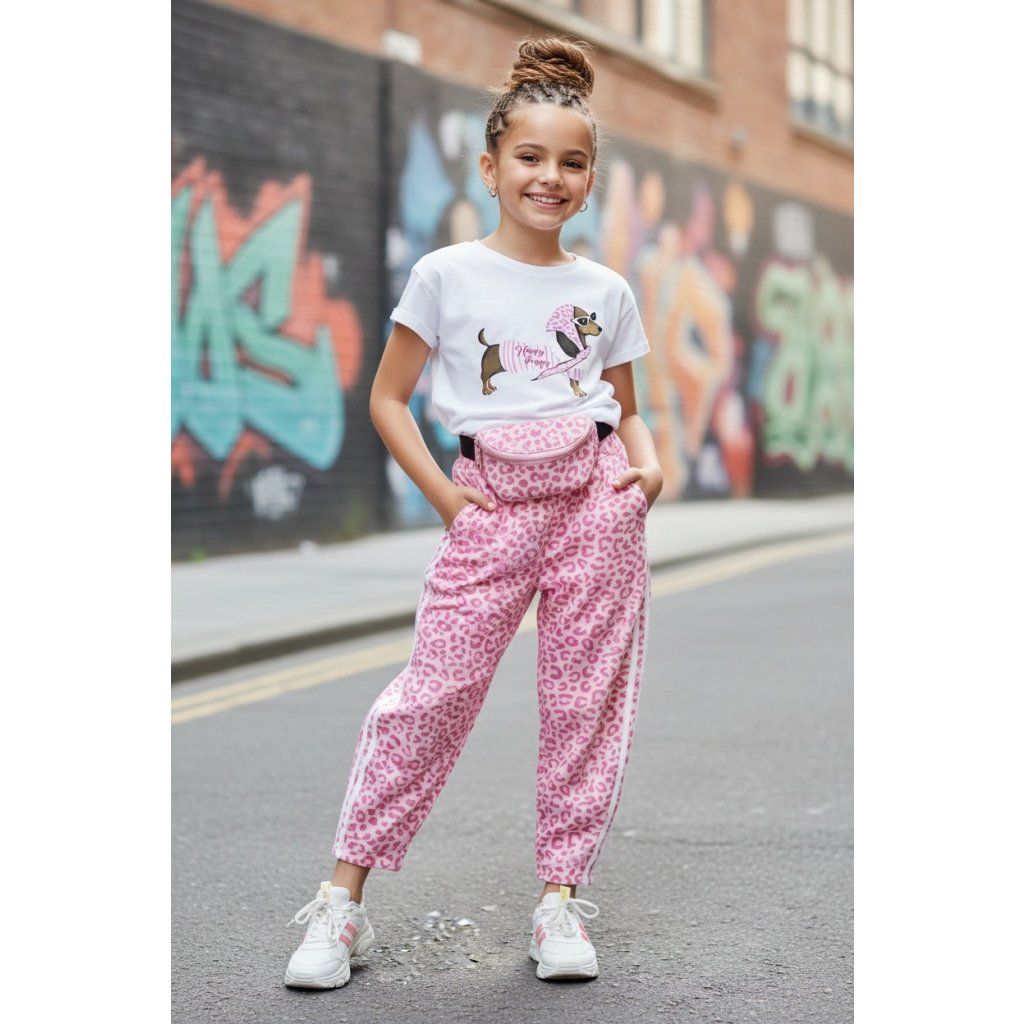 Tato dvoudílná dívčí souprava se skládá z pohodlného trička a stylových kalhot s leopardím vzorem, které jsou ideální na každodenní nošení a volnočasové aktivity. Tričko je vyrobeno ze 100% bavlny a zdobí ho veselý potisk psa, který malé slečny potěší. Kalhoty jsou lehké, vzdušné a pohodlné, zatímco leopardí vzor dodává oblečení moderní a hravý nádech.