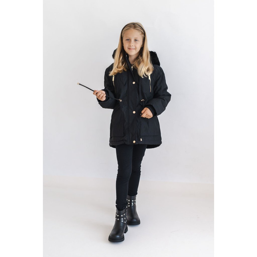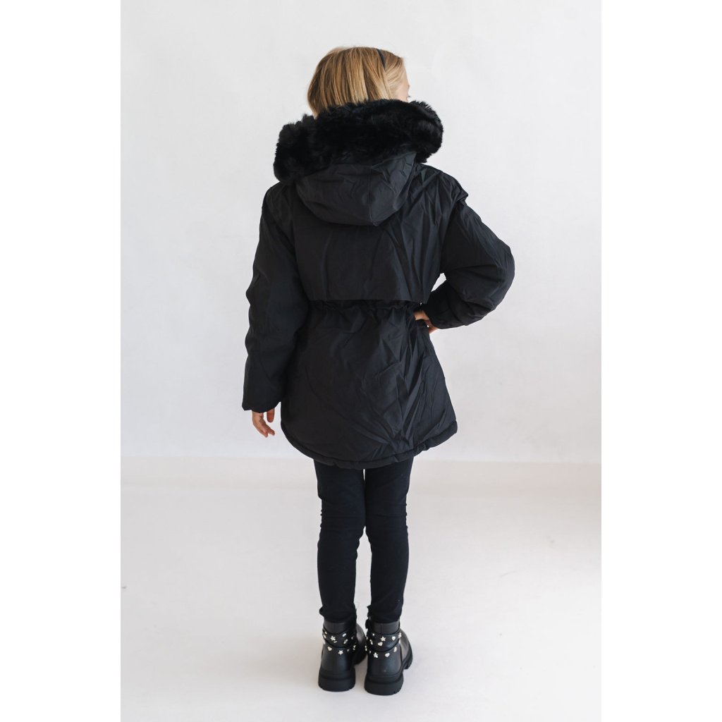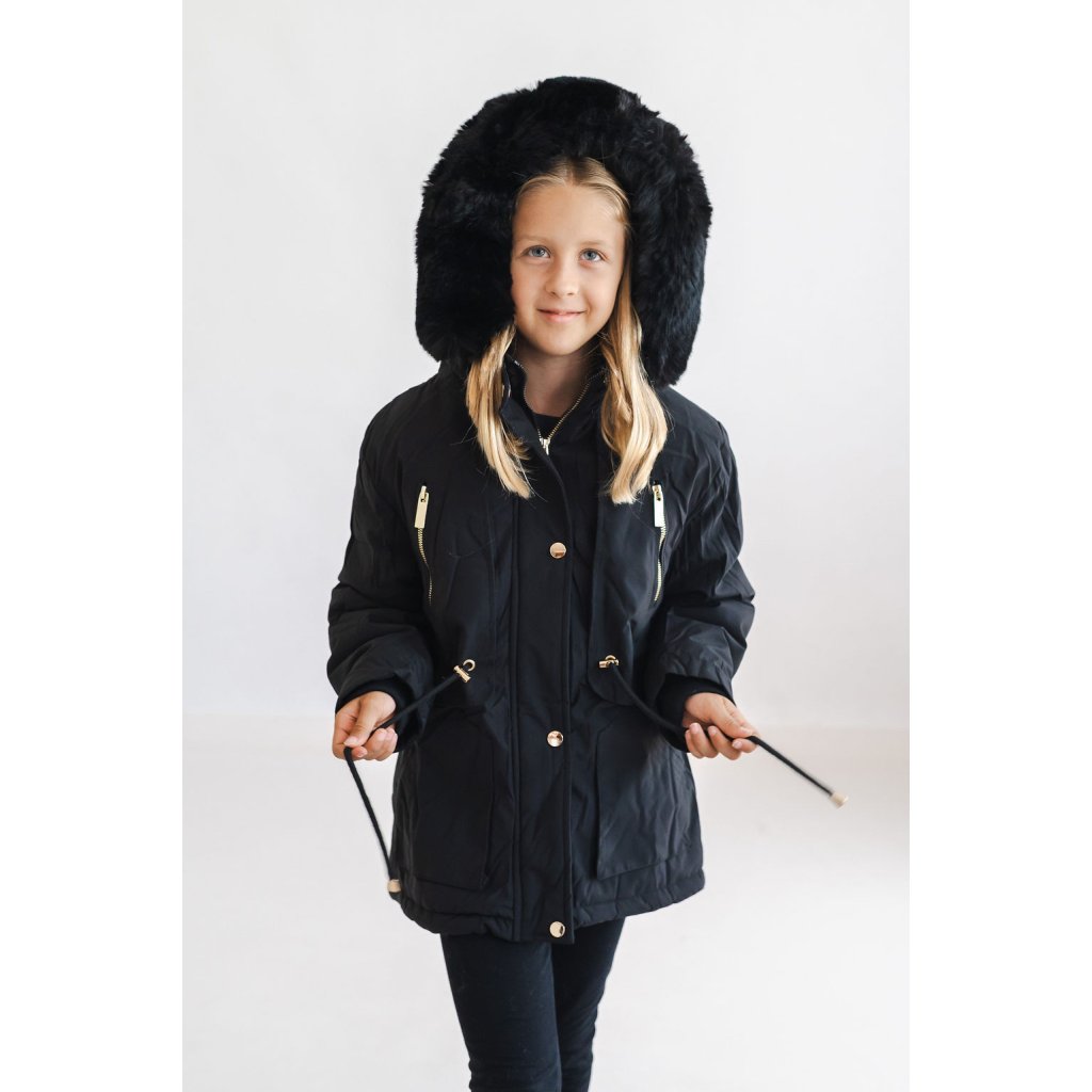 Dívčí zimní bunda, nepromokavá. Bunda má kapuci, kterou zdobí krásný huňatý kožíšek. Kapuce a kožíšek jsou odnímatelné.